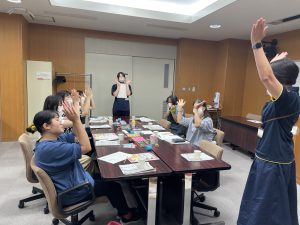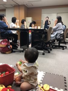 手遊びを披露し合う中で、現役保育士さんは、手遊びに加えて、現場での