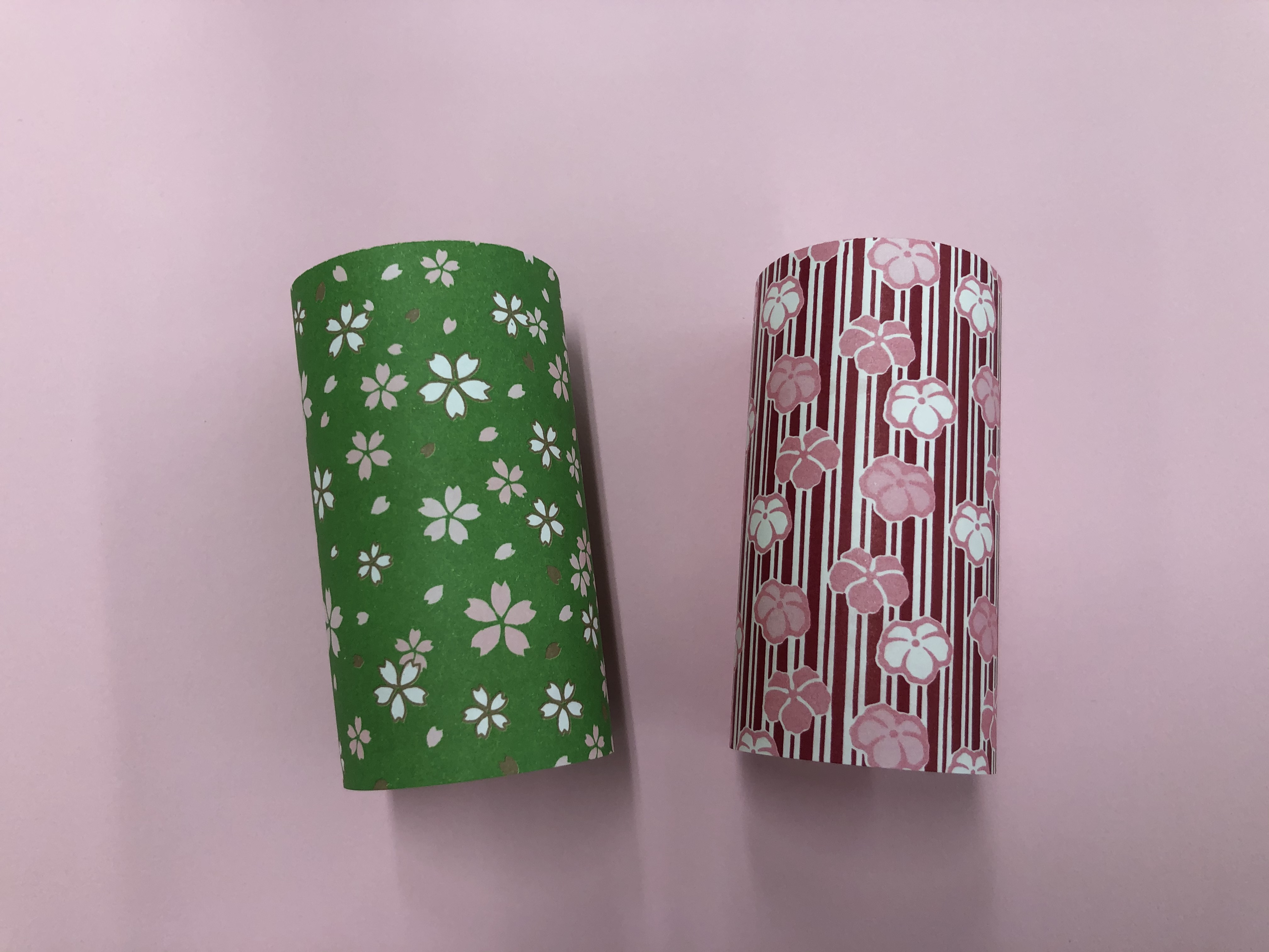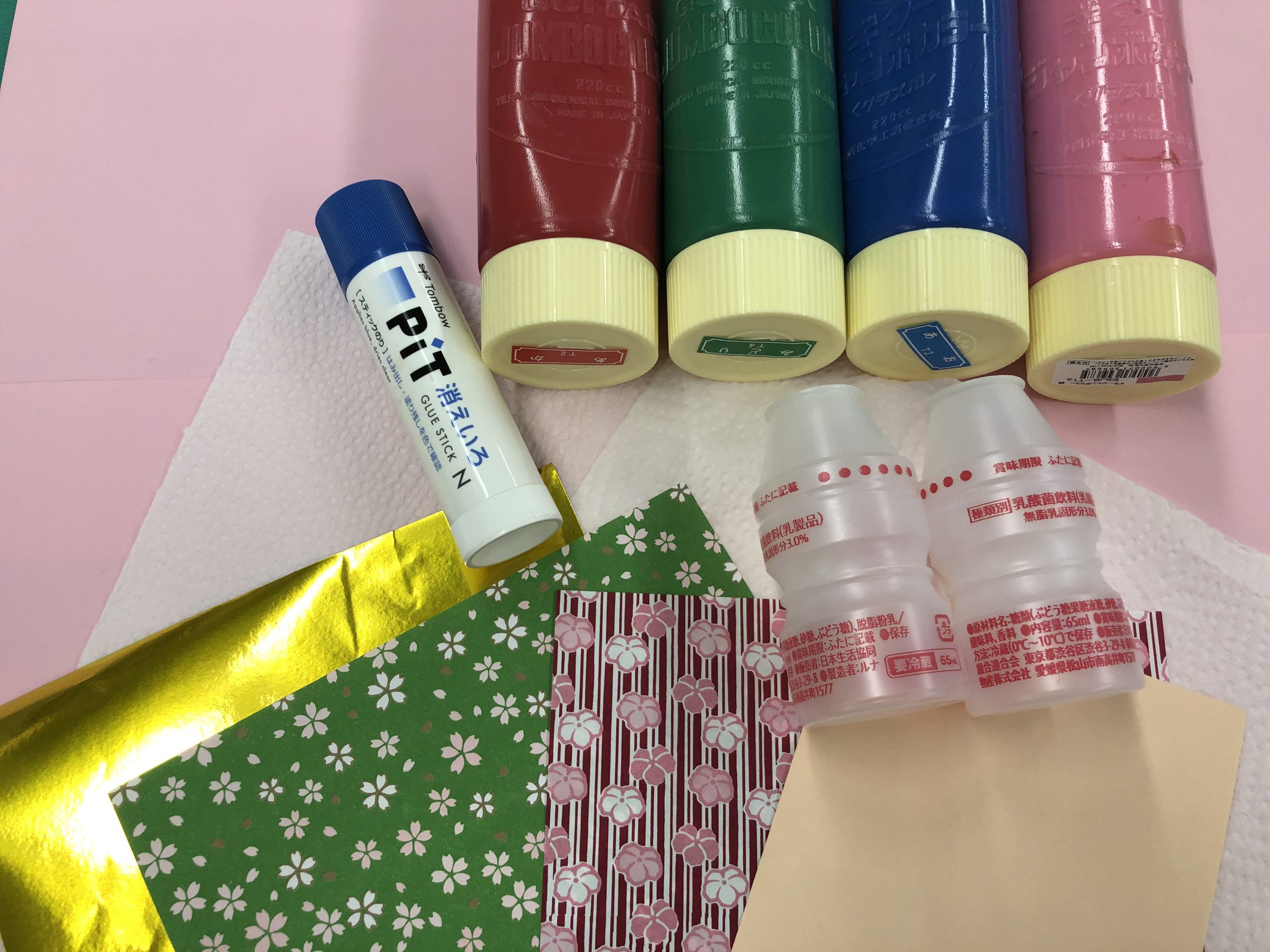 ④千代紙をヤクルトの容器に巻きつけて、のりで貼ります。