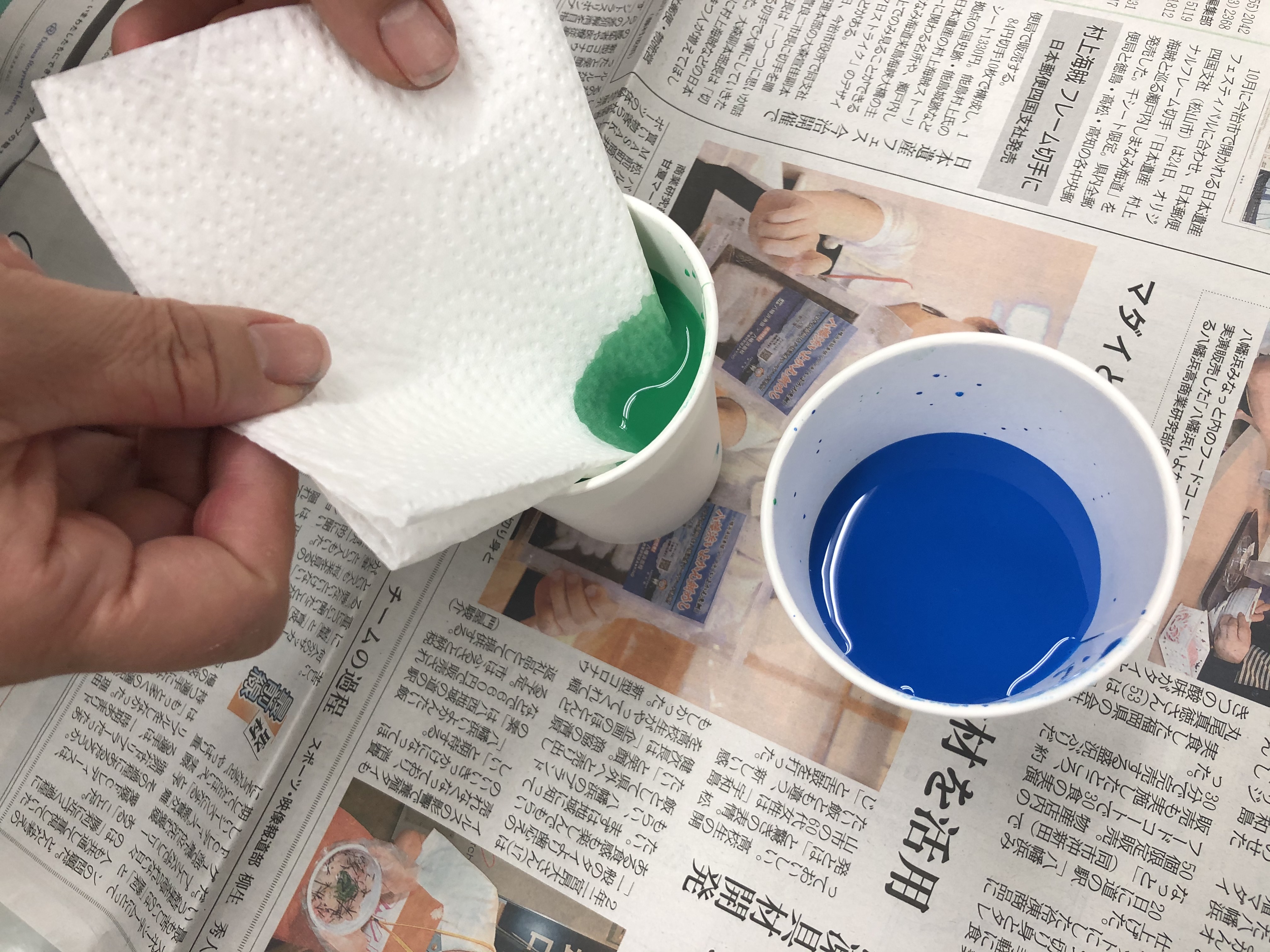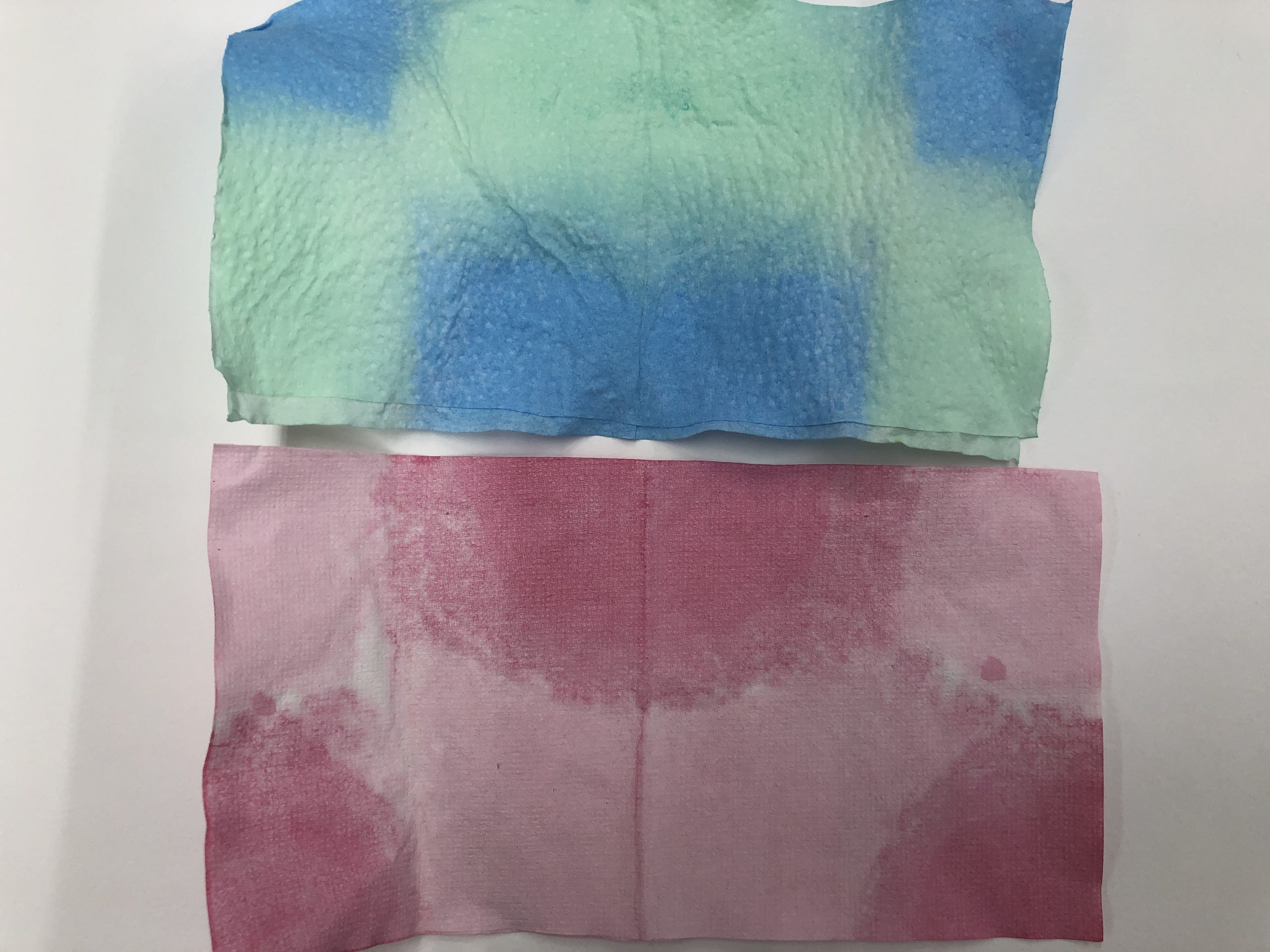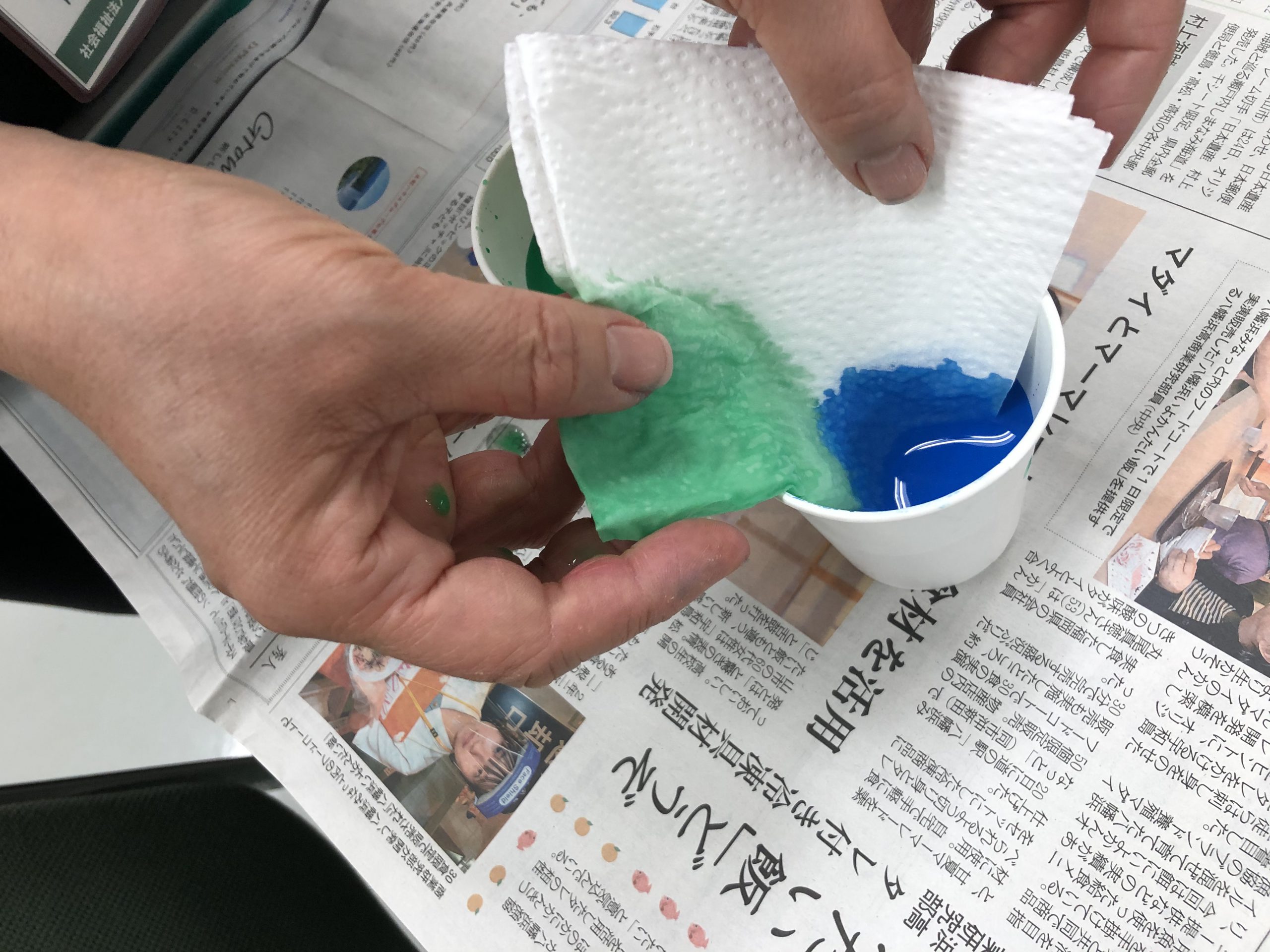 ②好きな色の絵具を水に溶かし、折ったキッチンペーパーにつけてにじませます。(複数色にじませても楽しめますよ。)