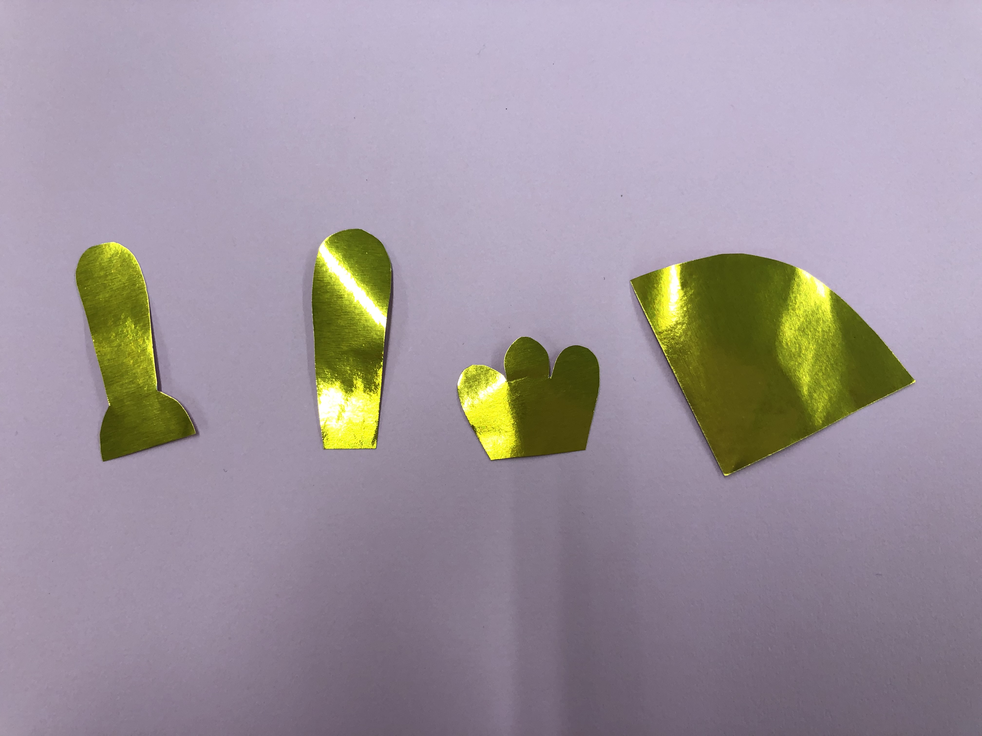 ⑥金色の折り紙で作った小物(おうぎ・かんむり・しゃく・えぼし)や顔を貼り付けます。