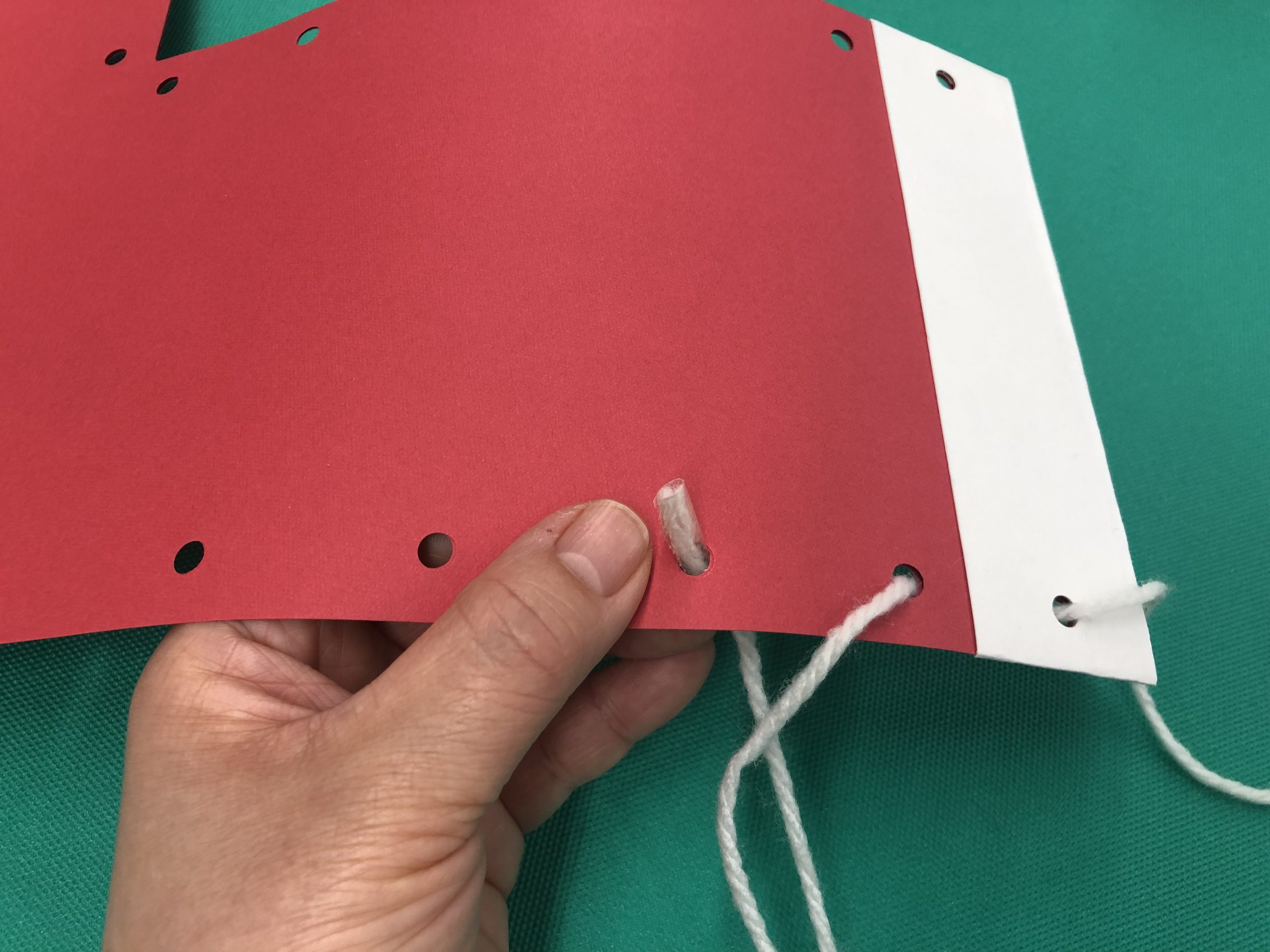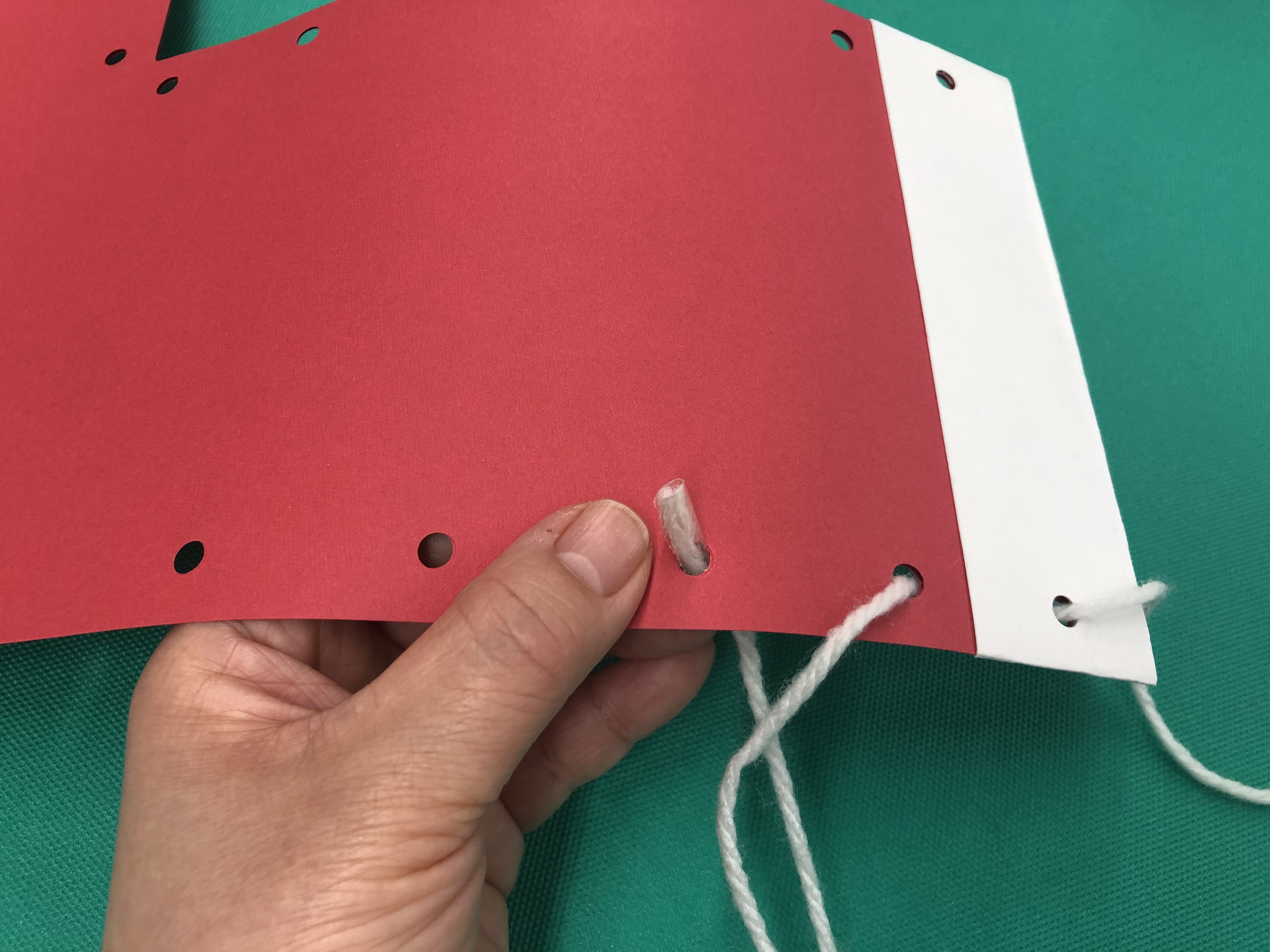 ⑥穴から出ている毛糸を結び持ち手を作ります。