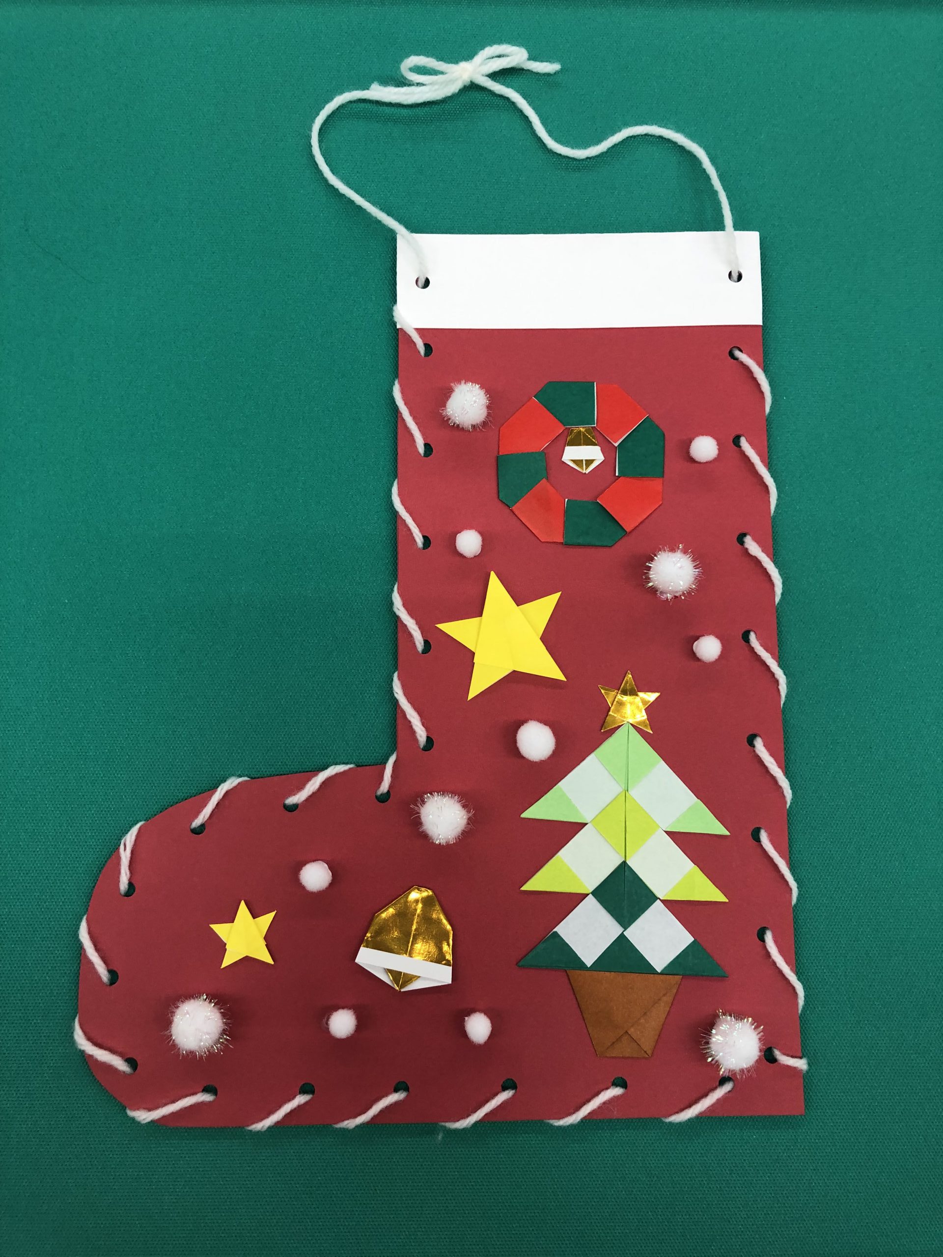 今回は折り紙で作ったクリスマスツリーやリース等を飾ってみました。