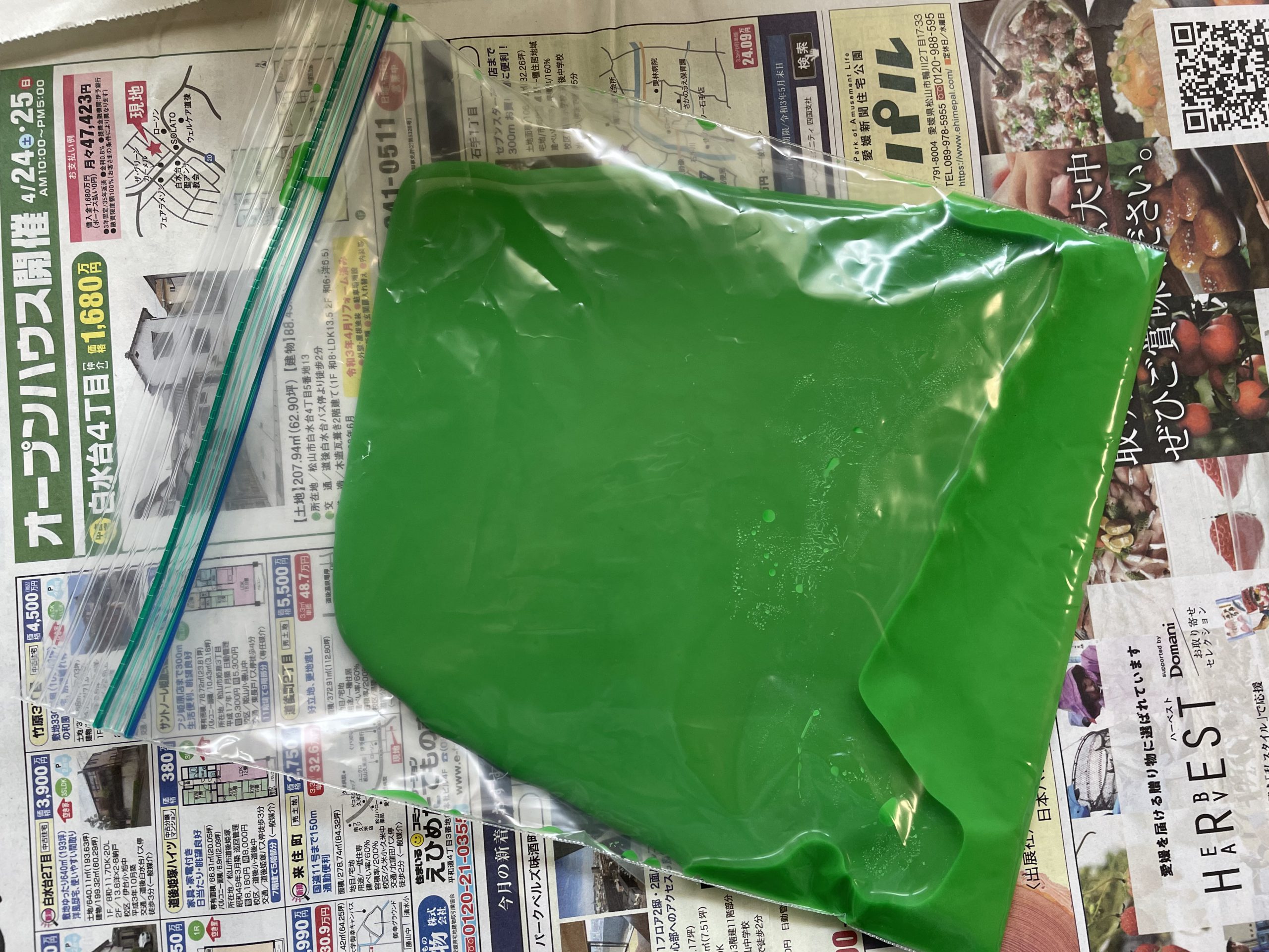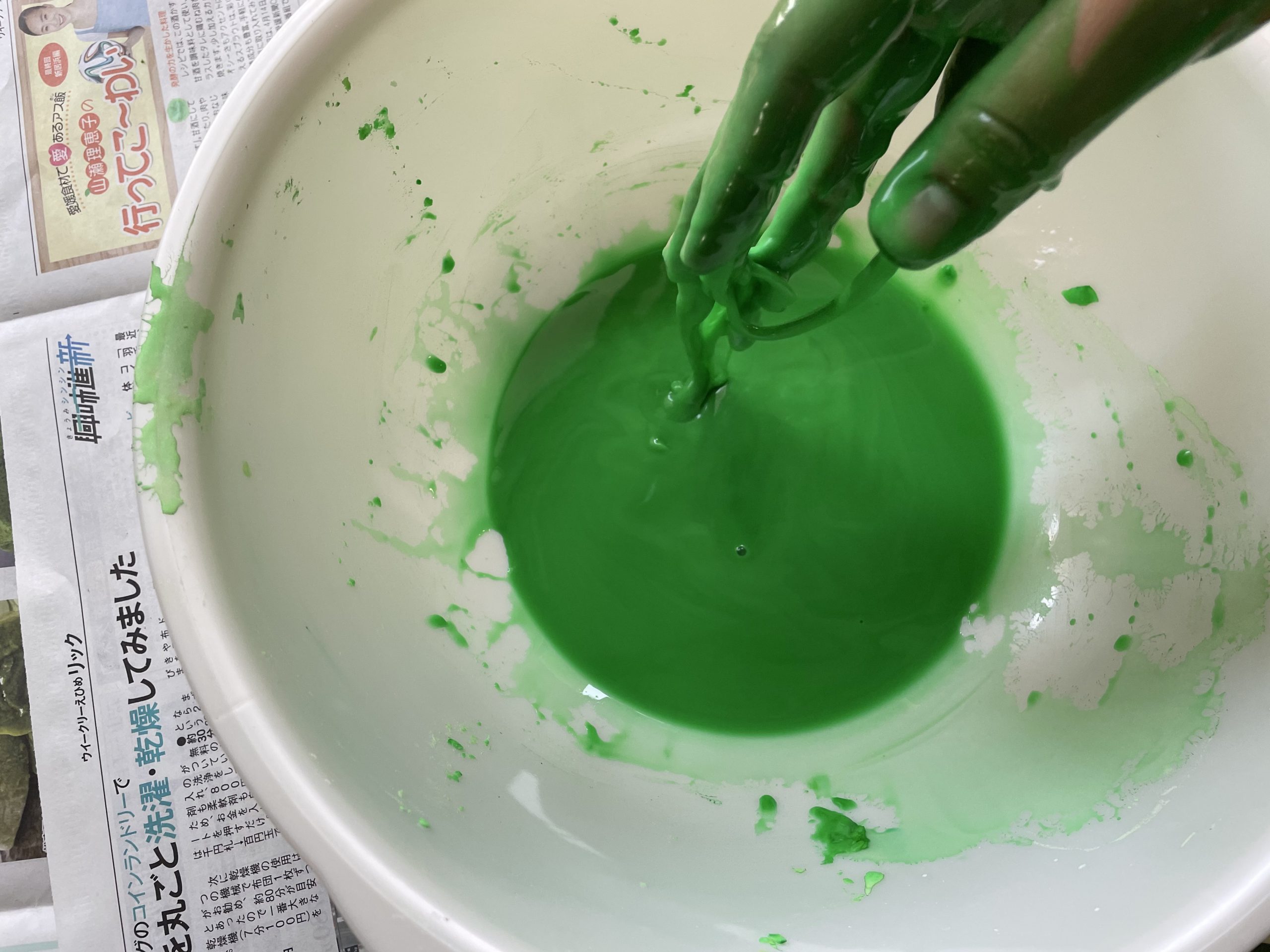 片栗粉で作るスライムは取り出すときは固く、手の平に乗せたり机の上に置いたりするとどろどろと流れます。