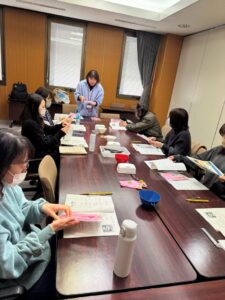 真剣に作業に取り組みながらも、近くに座っている方同士でおしゃべりを楽しまれていました。潜在保育士の方や資格取得に向けて頑張っている方が、現役保育士さんのお話を聞くことが出来、興味津々に聞かれていました。情報交換の場となり、嬉しく思います♪