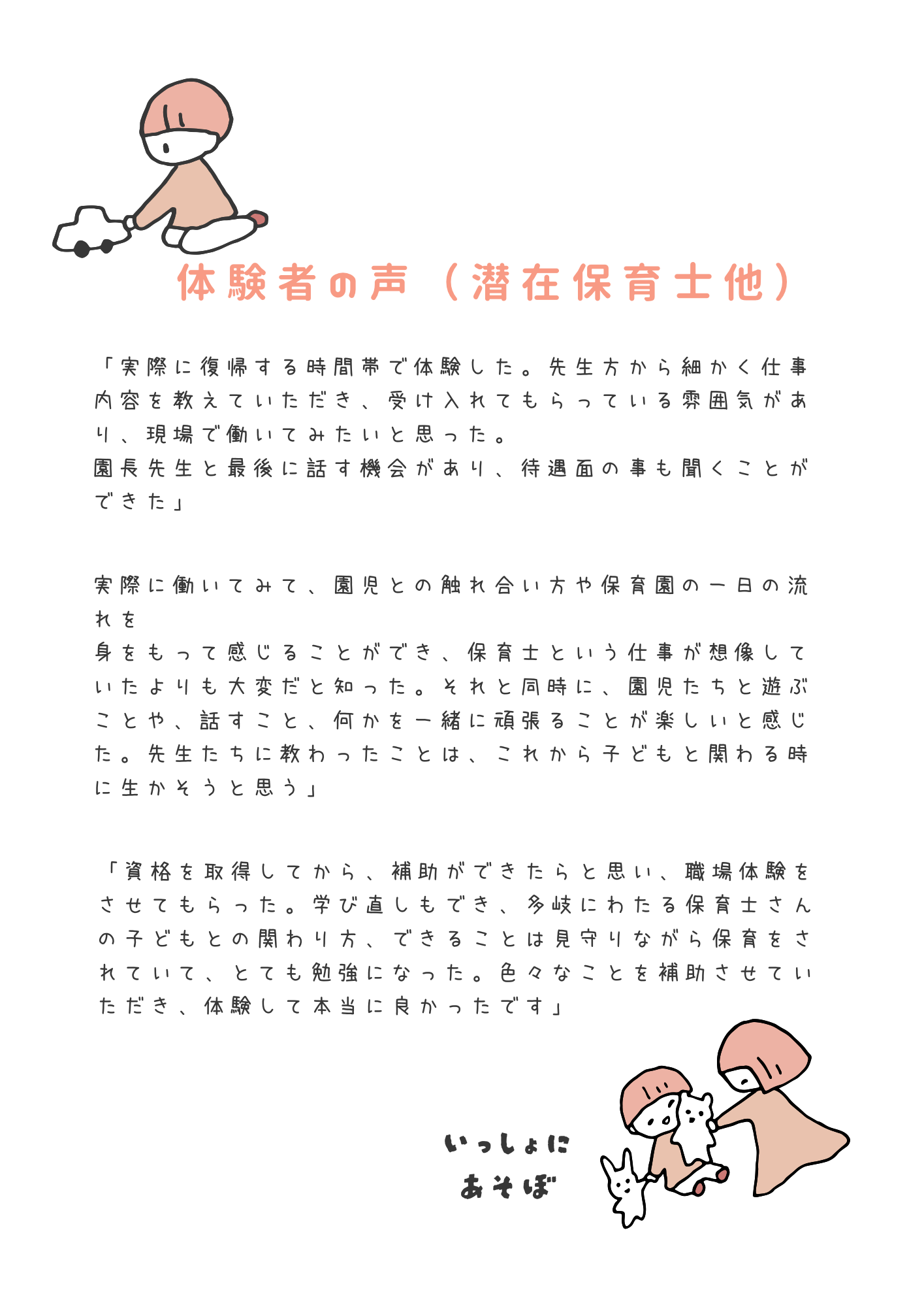 潜在保育士さんは、久しぶりの復帰の第一歩とされる方が多く、職場体験を経て11名の方が現場復帰されました。