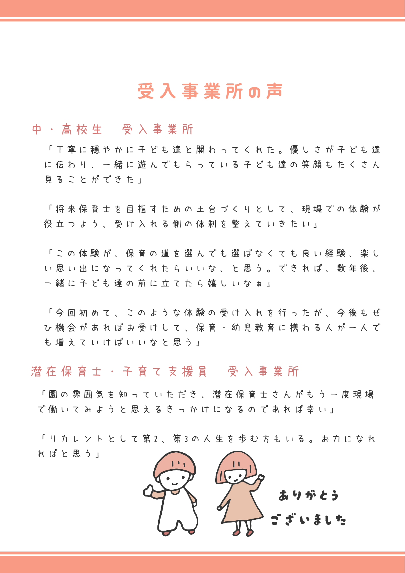 体験受け入れをしてくださった事業所のみなさま、日常の業務をこなしながら体験者のサポートをしてくださった先生方、ご協力ありがとうございました。