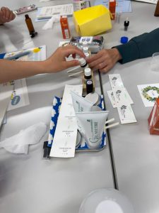 部屋に入った瞬間から素敵な香りに包まれ、精油の選び方や効能、注意点などを熱心に聞いています。