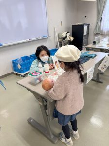 赤ちゃんの抱っこ体験では、3キロの赤ちゃんを子どもから大人まで抱っこを体験していました。