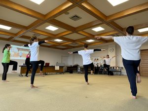 フラミンゴのポーズでは「目線をまっすぐにしているとフラフラしにくい」ということを学んだり