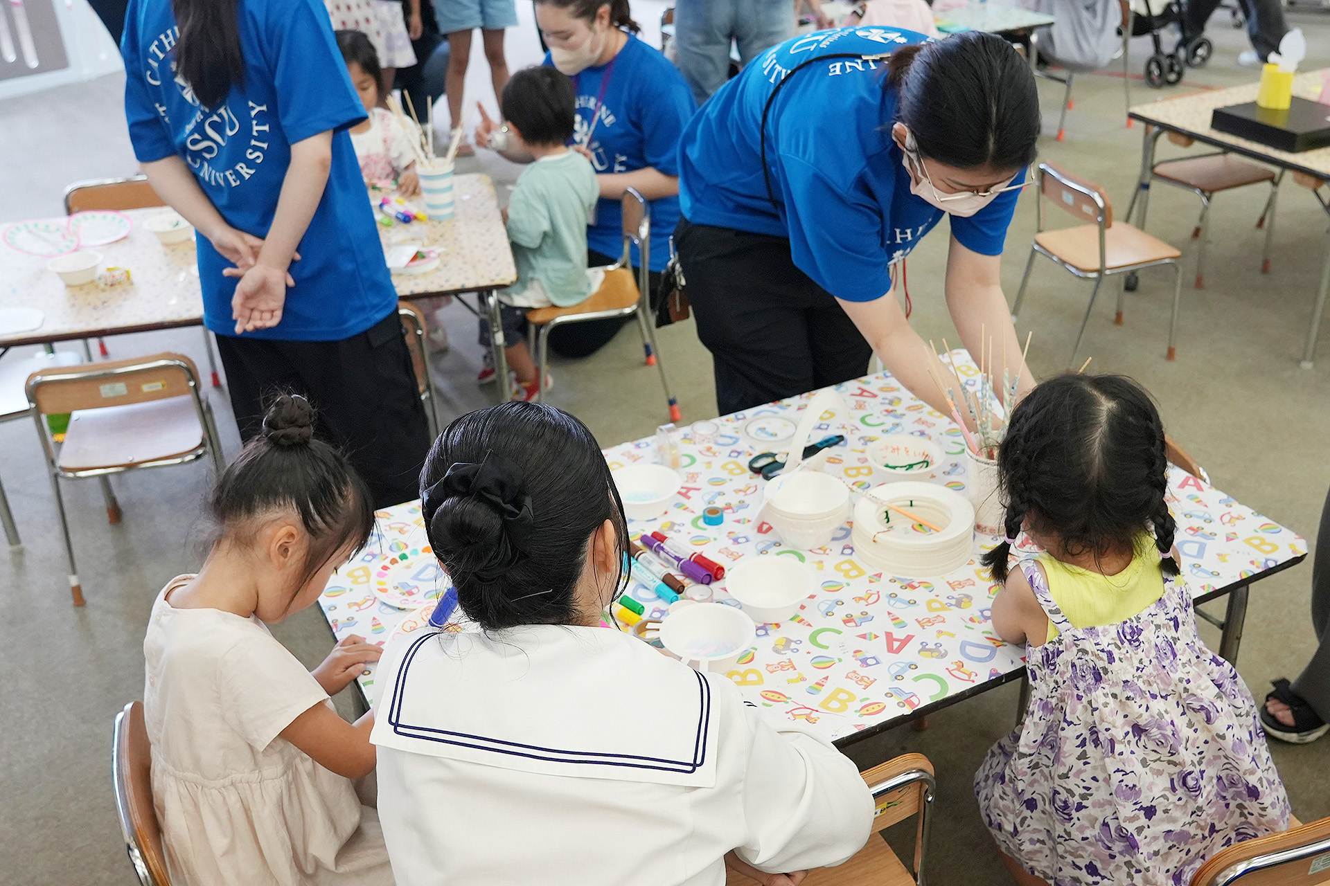 保育の魅力発信のため1階では、保育士を目指す養成校の学生が、来場した子どもたちと一緒製作などを楽しんでいました。