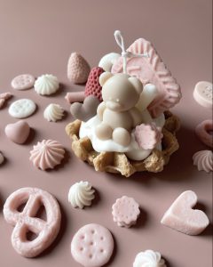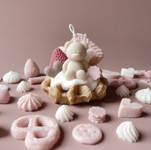 ワッフルキャンドルに、可愛いスイーツパーツを選び、お好きな香りで香り付けしたクリームを垂らしてトッピングしたら完成です♪
