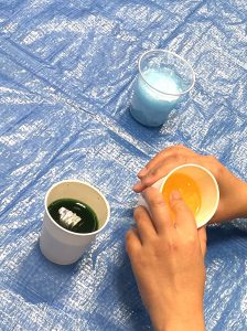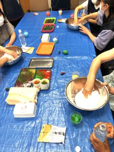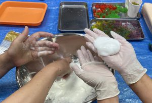 凍ったスライムが少しずつ溶けるのを楽しみながら、分量を変えた硬さの違う寒天スライムの