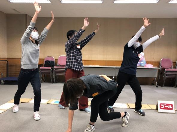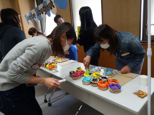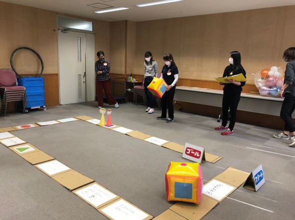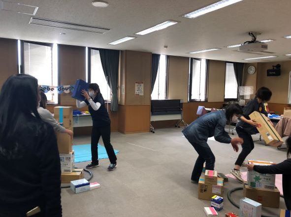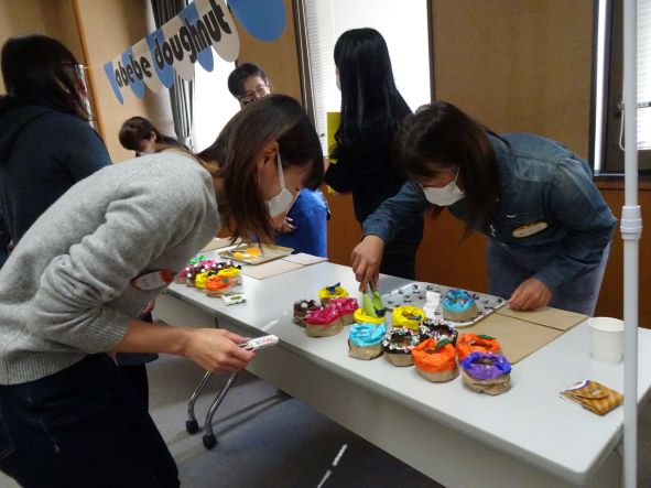 ドーナツ制作やお店屋さんごっこをしたり、2チームに分かれて段ボール積み上げ競争をしたり、