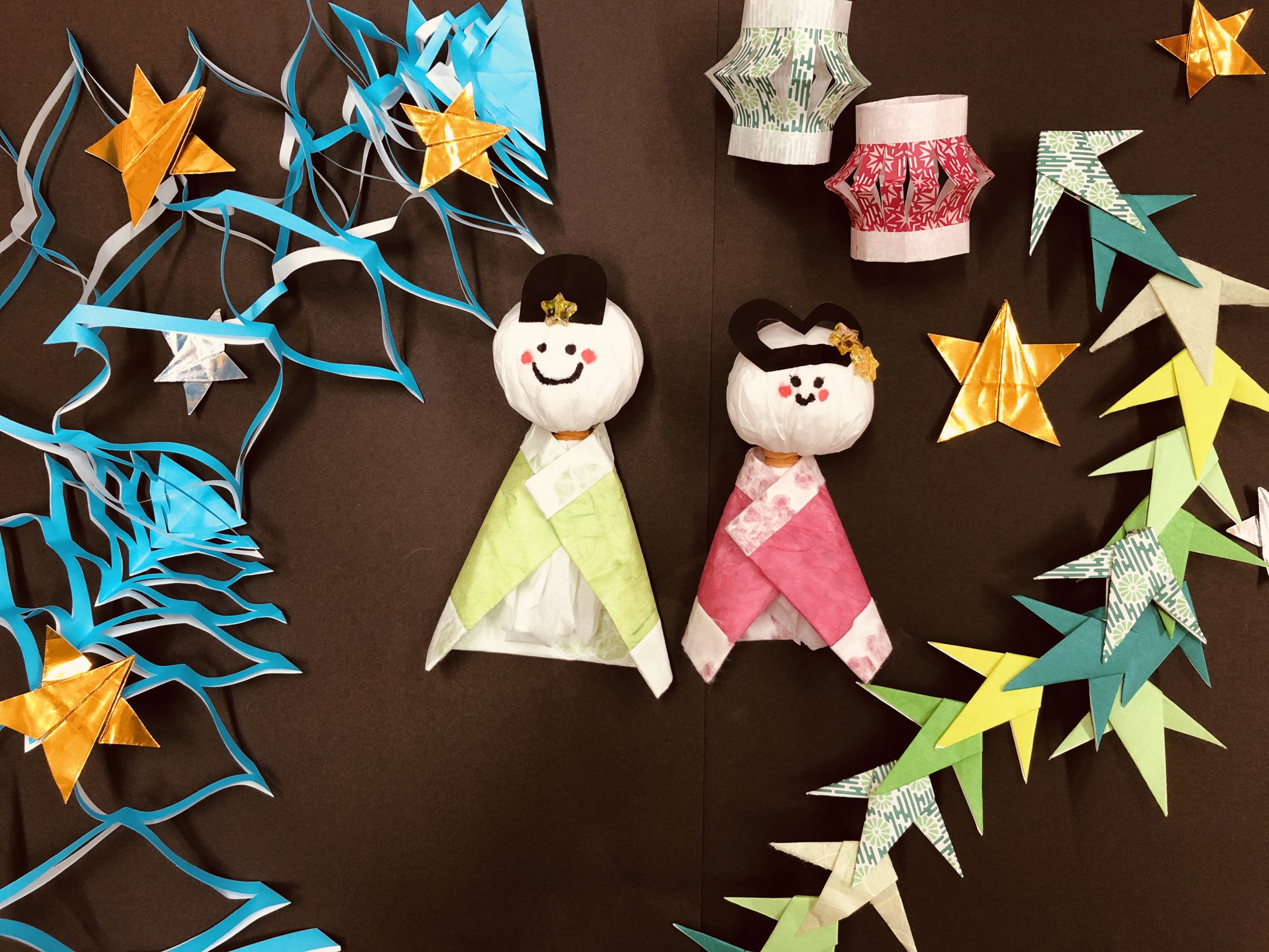 6月に作った“てるてるぼうず”に服を着せて、織姫と彦星にしました。 制作だけではなく遊びもですが、毎回新しいものを一から…は難しいですよね。 再利用できるものはうまく活用しながら保育ができるといいなぁと思います。