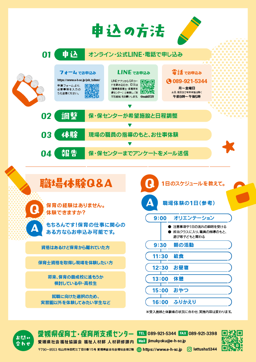 保育の仕事に関心のある方へ職場体験の機会をご用意しました。保育現場の雰囲気や保育士の具体的な業務にふれることで、就職や卒業後の進路を考える際の参考としていただければと思います。保育の魅力ややりがいを感じていただける貴重な体験となりますので、ぜひご参加ください。