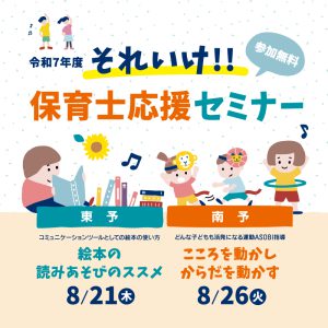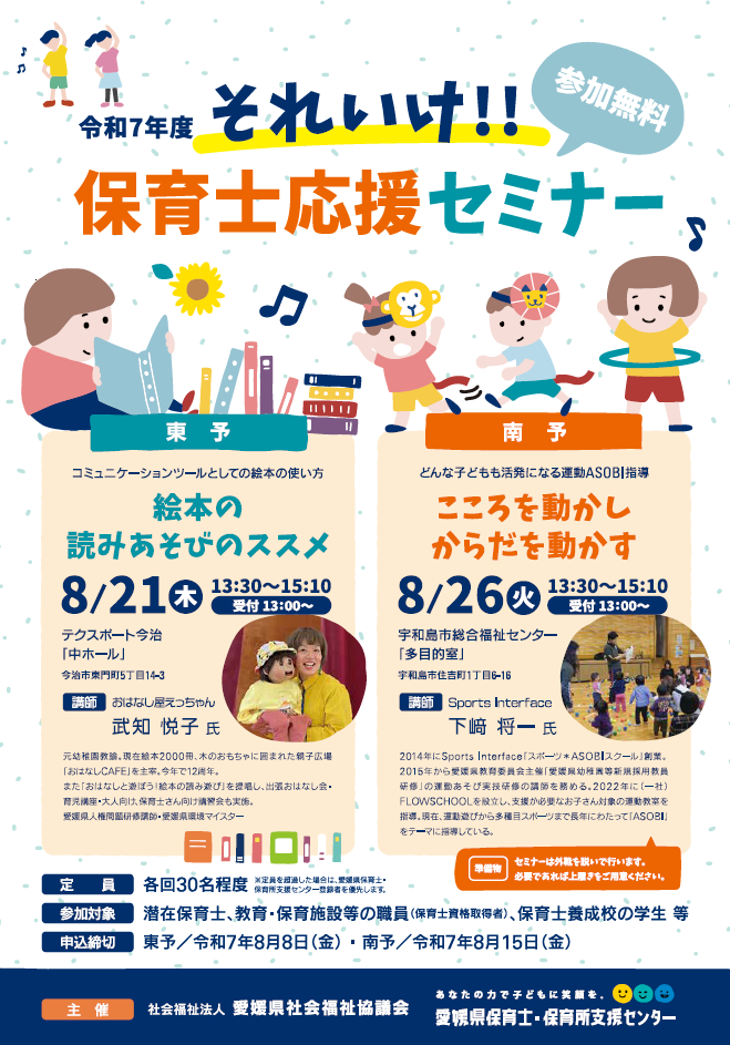 講演タイトル | 📚【東予】「コミュニケーションツールとしての絵本の使い方 〜絵本の読みあそびのススメ」 🤸【南予】「どんな子どもも活発になる運動ASOBI指導 〜こころを動かしからだを動かす」 |